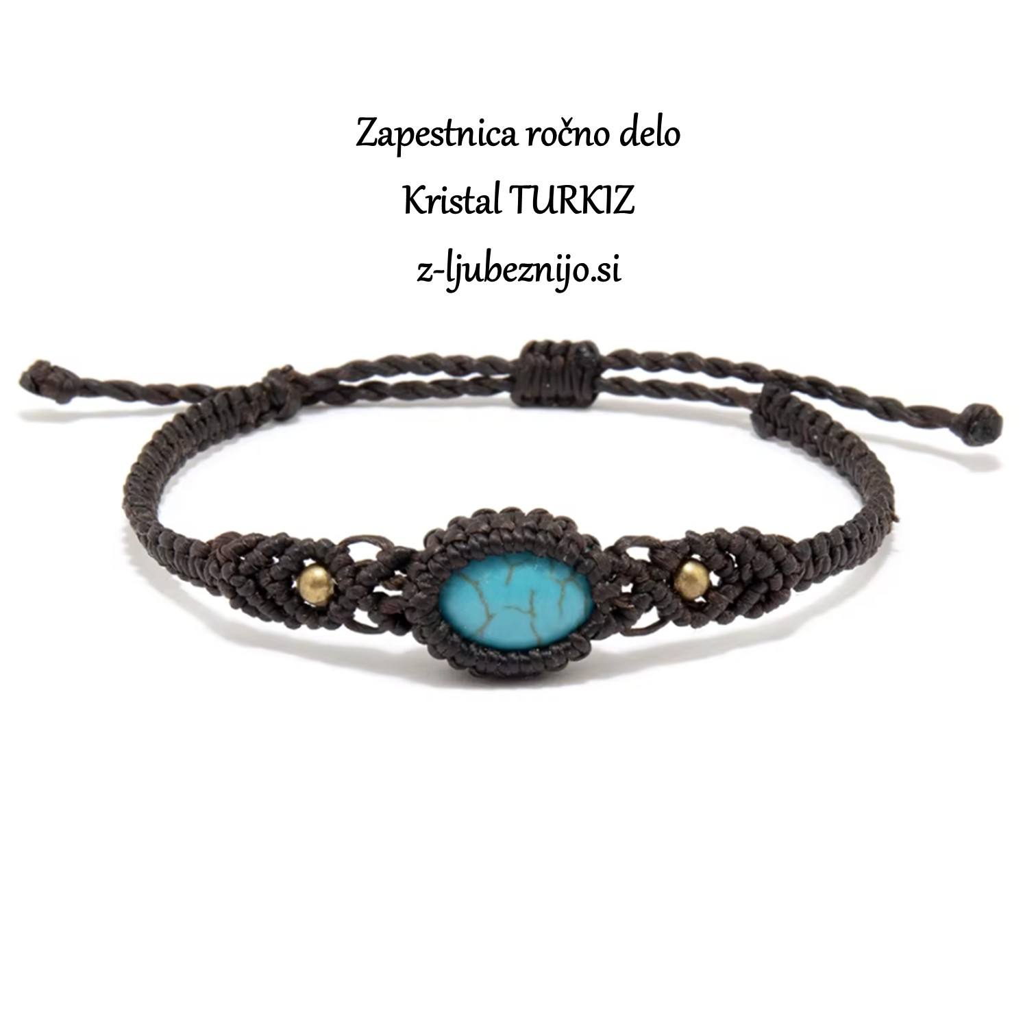 Unikatna makrame zapestnica, ročno ustvarjena iz ljubezni, v sebi nosi kristal turkiz, ki že stoletja velja za poseben amulet. Njeni vozli nežno poudarijo naravno lepoto kamna.