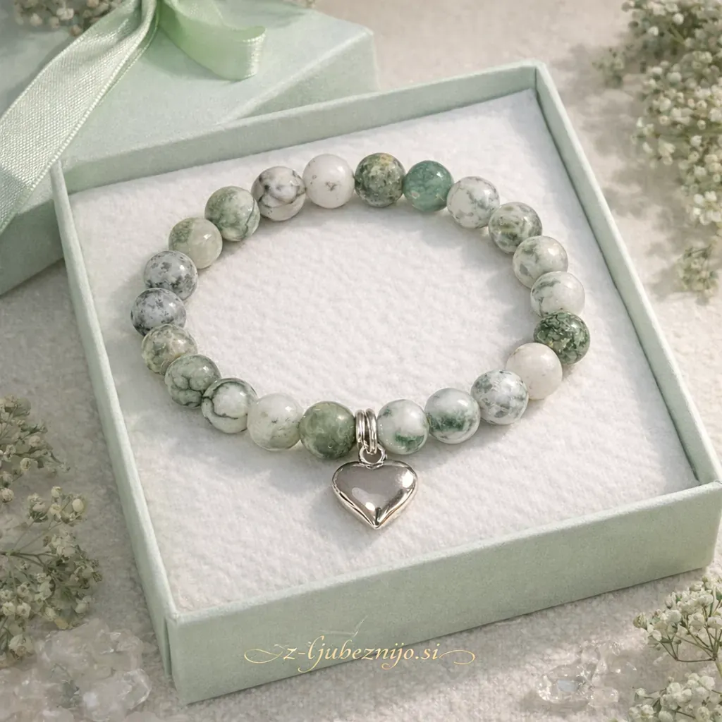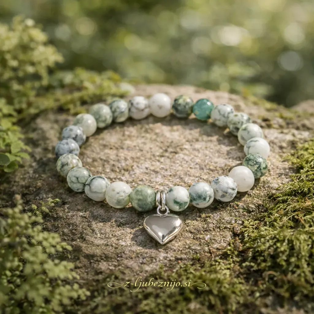 Zapestnica Amoria nosi v sebi nežnost, mir in toplino. Njeni mehki beli in zeleni odtenki ustvarjajo občutek ravnovesja ter spominjajo na svežino narave, tišino jutra in lahkotnost novih začetkov. V središču zapestnice se nežno zasveti droben srček – simbol ljubezni, povezanosti in pozornosti do sebe.