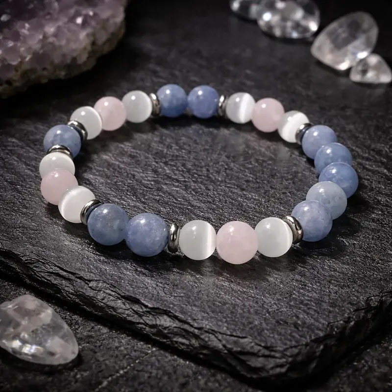 Zapestnica za Pogum je ročno izdelan energijski nakit, ki združuje moč treh nežnih, a izjemno močnih kristalov: roževca, akvamarina in selenita. Namenjena je vsem, ki si želijo več samozavesti, notranjega miru in srčne jasnosti pri premagovanju življenjskih izzivov.