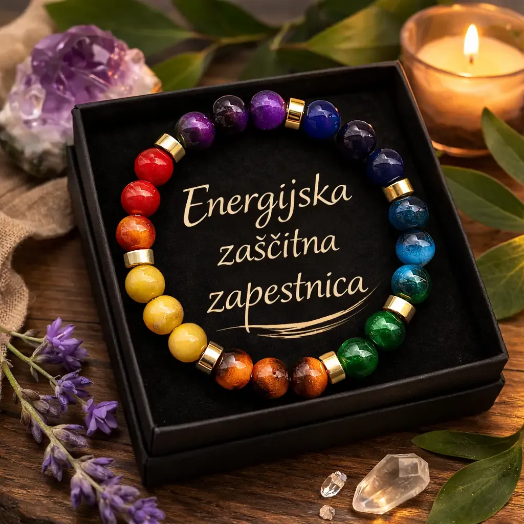 Zapestnica za zaščito naše energije je zasnovana kot simbol harmonije med telesom in energijo, ki nas obdaja. Njene barve sledijo naravnemu zaporedju energij v telesu – od toplih zemeljskih tonov do globokih, umirjenih odtenkov neba in vesolja. Vsaka barva predstavlja eno izmed čaker in pomaga, da se energija v telesu ponovno poveže v harmonično celoto.
